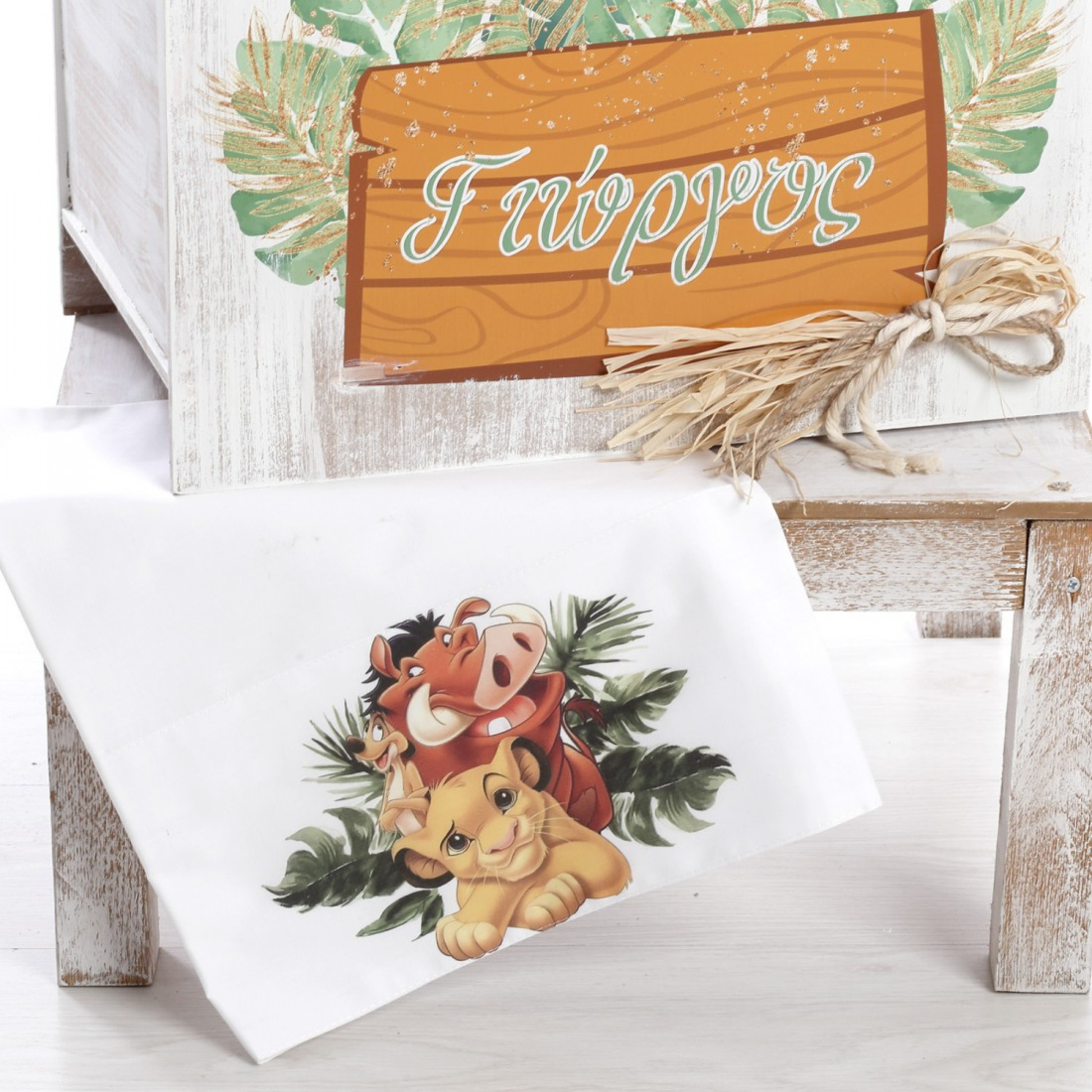 Ολοκληρωμένο βαπτιστικό σετ με αγαπημένο θέμα Lion King, διακοσμημένο με υψηλής ποιότητας UV εκτύπωση σε τροπικό στυλ. Ζωντανά χρώματα και χαρούμενα σχέδια ιδανικά για μια ξεχωριστή βάπτιση.