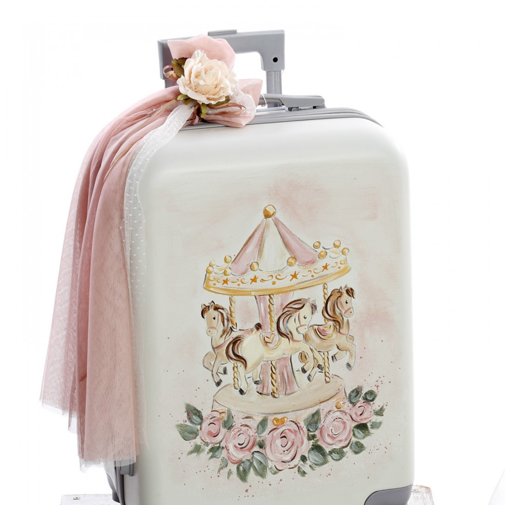Βαλίτσα τροχήλατη ζωγραφισμένη στο χέρι, με εντυπωσιακή παράσταση καρουζέλ, ρομαντικά τριαντάφυλλα και χρυσές λεπτομέρειες. Στολισμένη με τούλια, φιόγκους και λουλούδια.          (Διαστάσεις: 57cm x 40cm x 22cm)