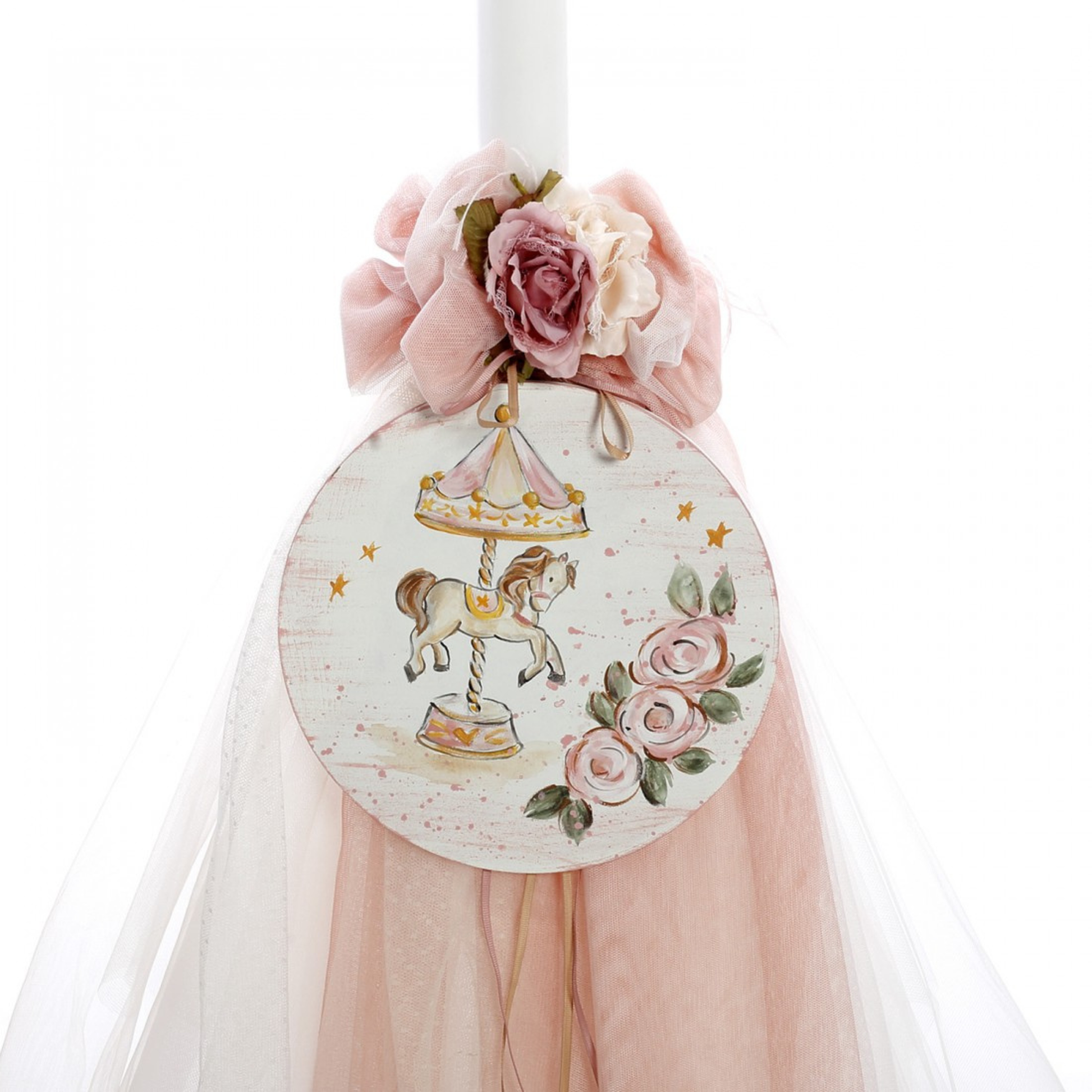 Λαμπάδα βάπτισης, διακοσμημένη με ξύλινο στοιχείο καρουζέλ, αέρινα τούλια, ρομαντικά λουλούδια και κορδέλες.