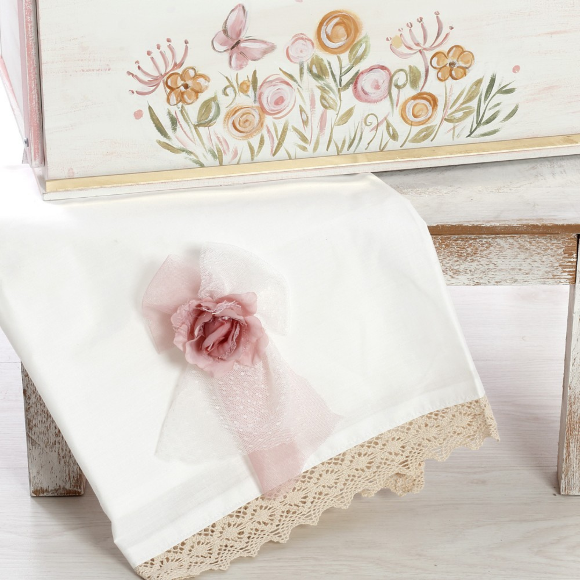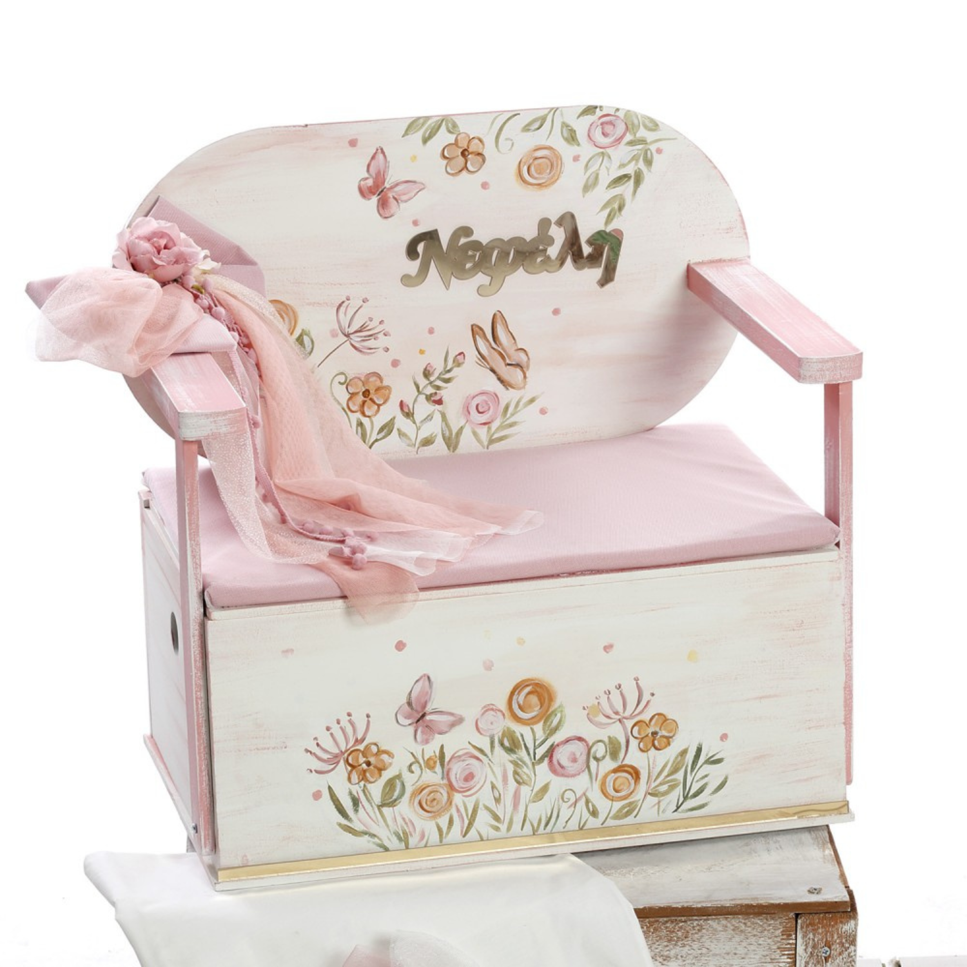 ✔ Ξύλινο παγκάκι-κουτί βάπτισης ζωγραφισμένο στο χέρι, με πολύχρωμα αγριολούλουδα, πεταλούδες και ρομαντικές λεπτομέρειες σε παστέλ αποχρώσεις. (Διαστάσεις: 50cm x 52cm x 32cm)