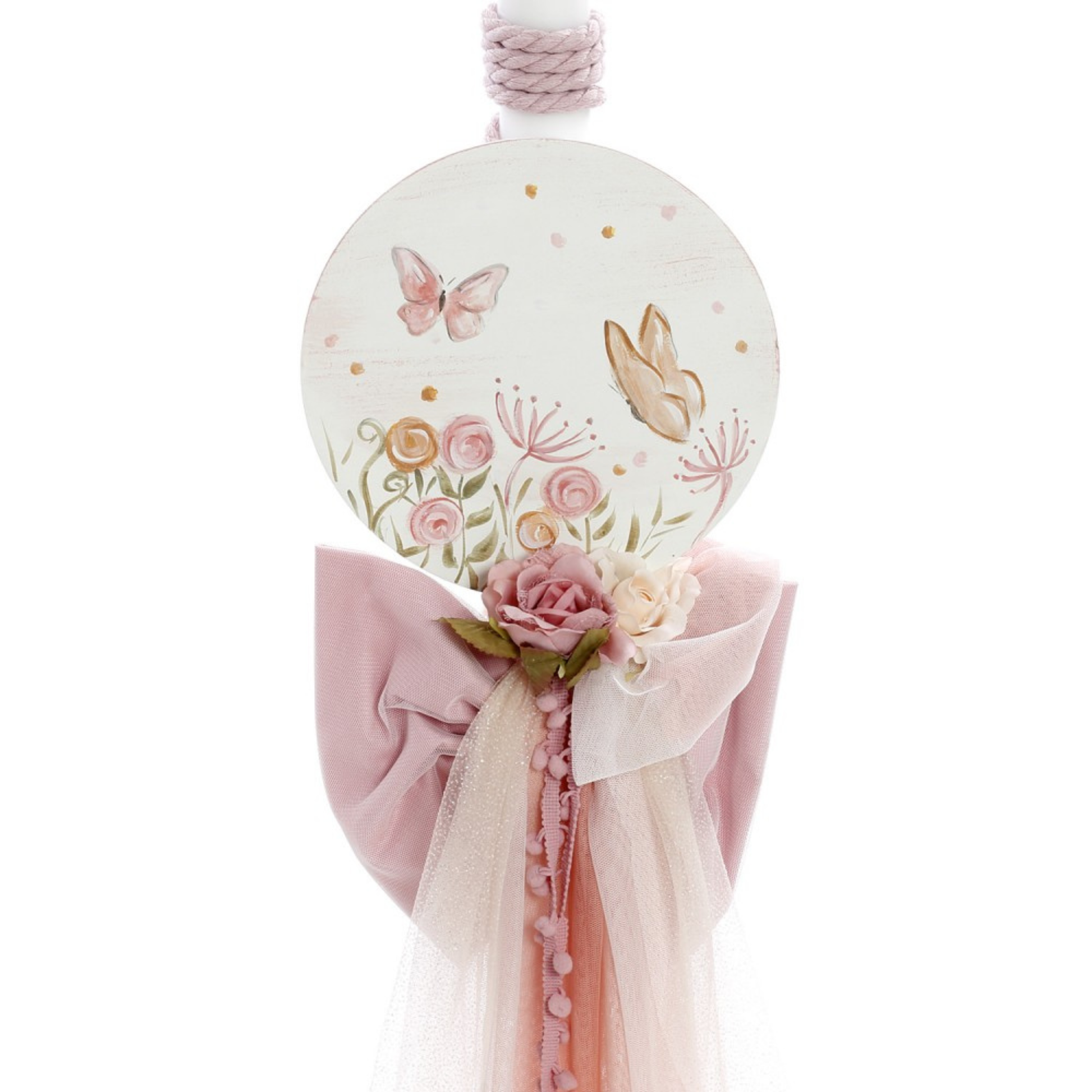 ✔ Λαμπάδα βάπτισης, διακοσμημένη με ξύλινο στοιχείο ζωγραφισμένου λουλουδιού και πεταλούδων, πολυτελή τούλια και ρομαντικά λουλούδια.