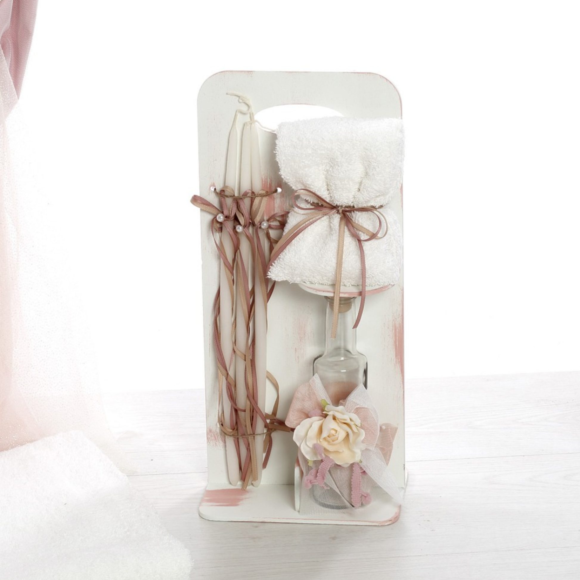 ✔ Σετ λαδιού με μπουκαλάκι, σαπούνι και κεράκια, διακοσμημένα με φιόγκους και vintage floral στοιχεία.