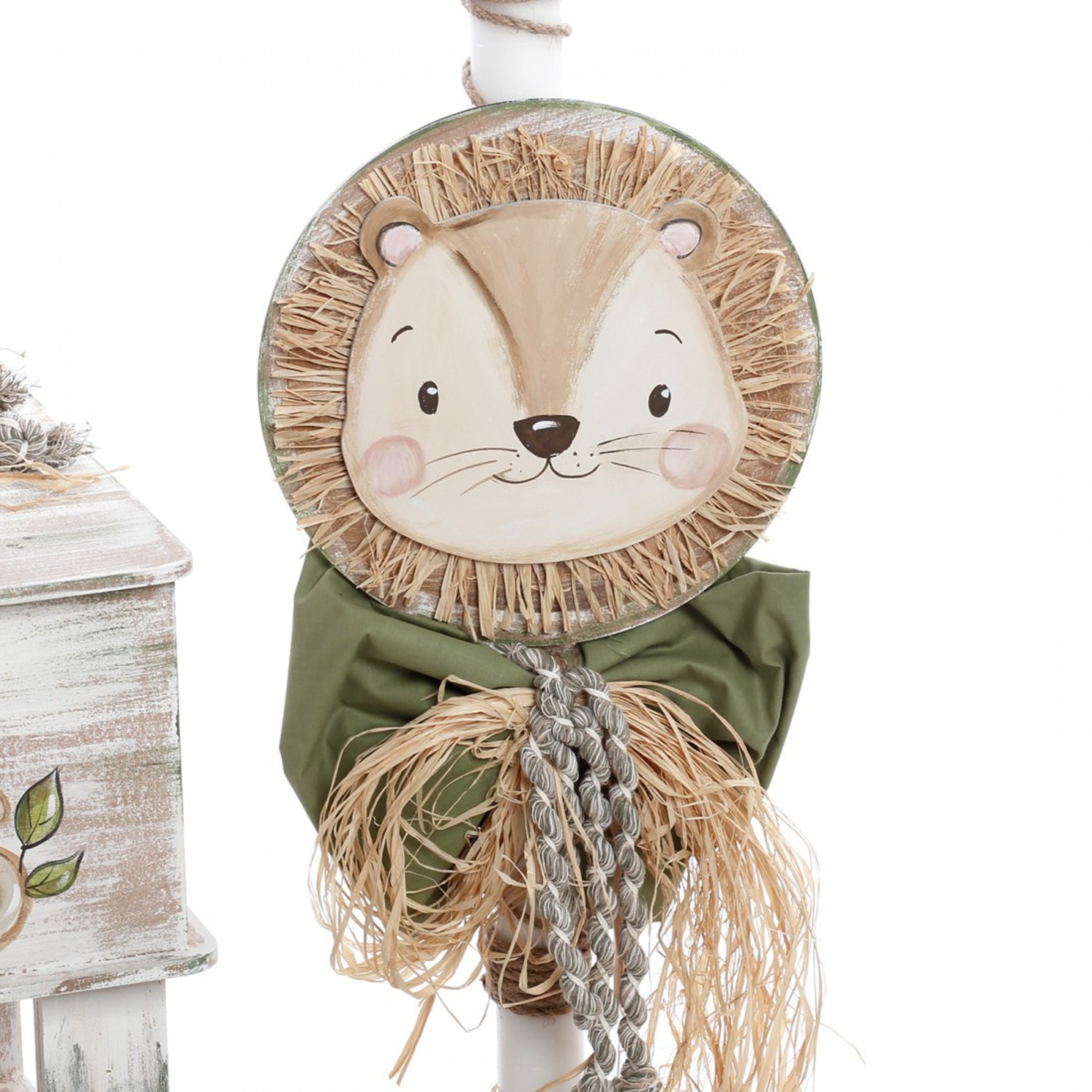 ✔ Λαμπάδα βάπτισης, διακοσμημένη με ξύλινο στοιχείο λιονταριού,σχοινιά και βαμβακερά υφάσματα σε earthy τόνους.