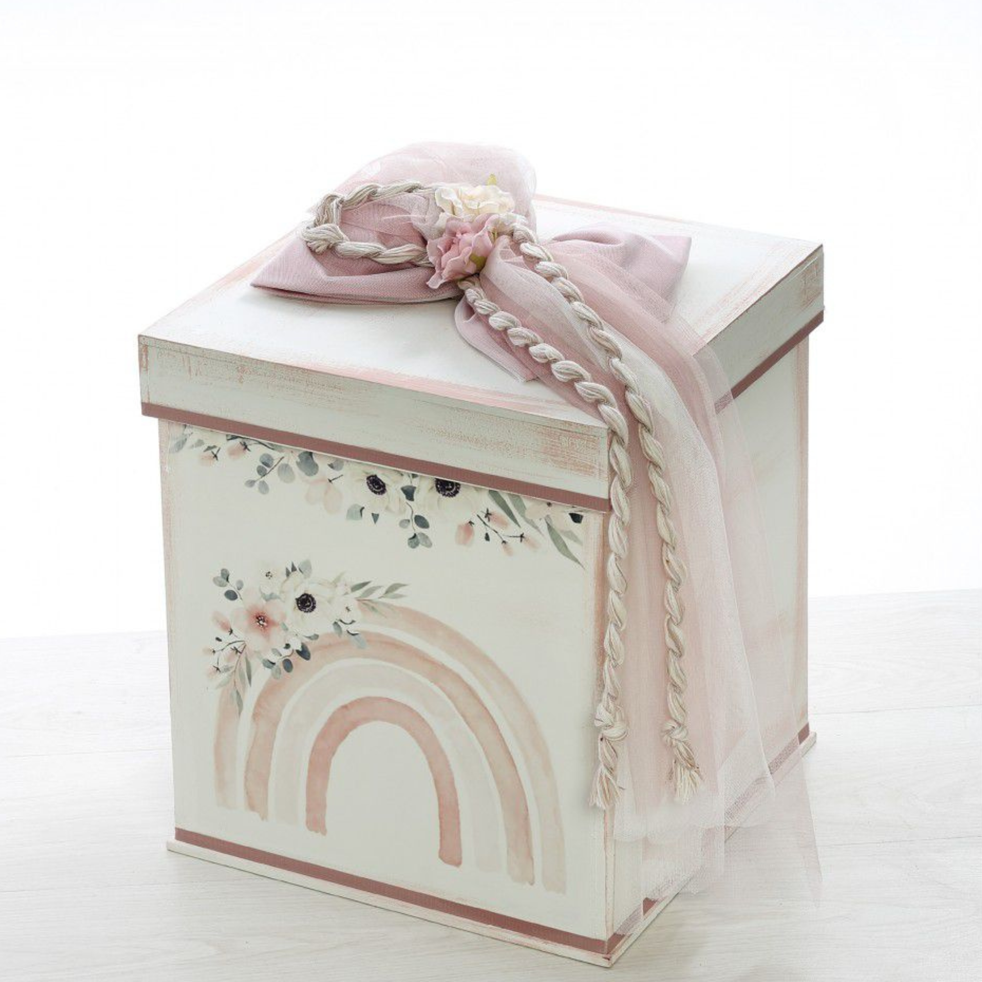 ✔ Μπαούλο ζωγραφισμένο με το ουράνιο τόξο και διακοσμημένη με υφασμάτινες κορδέλες & σχοινιά. (Διαστάσεις: 57cm x 40cm x 22cm)